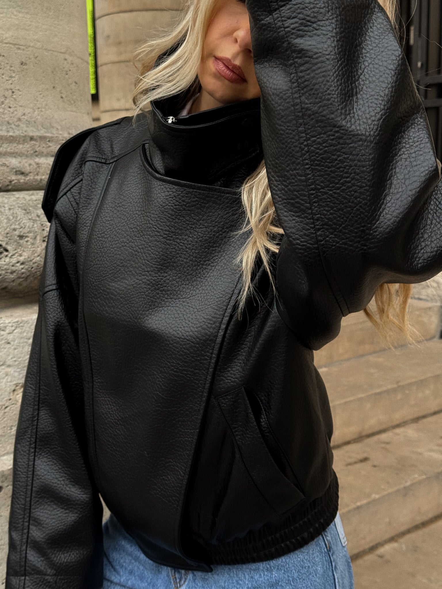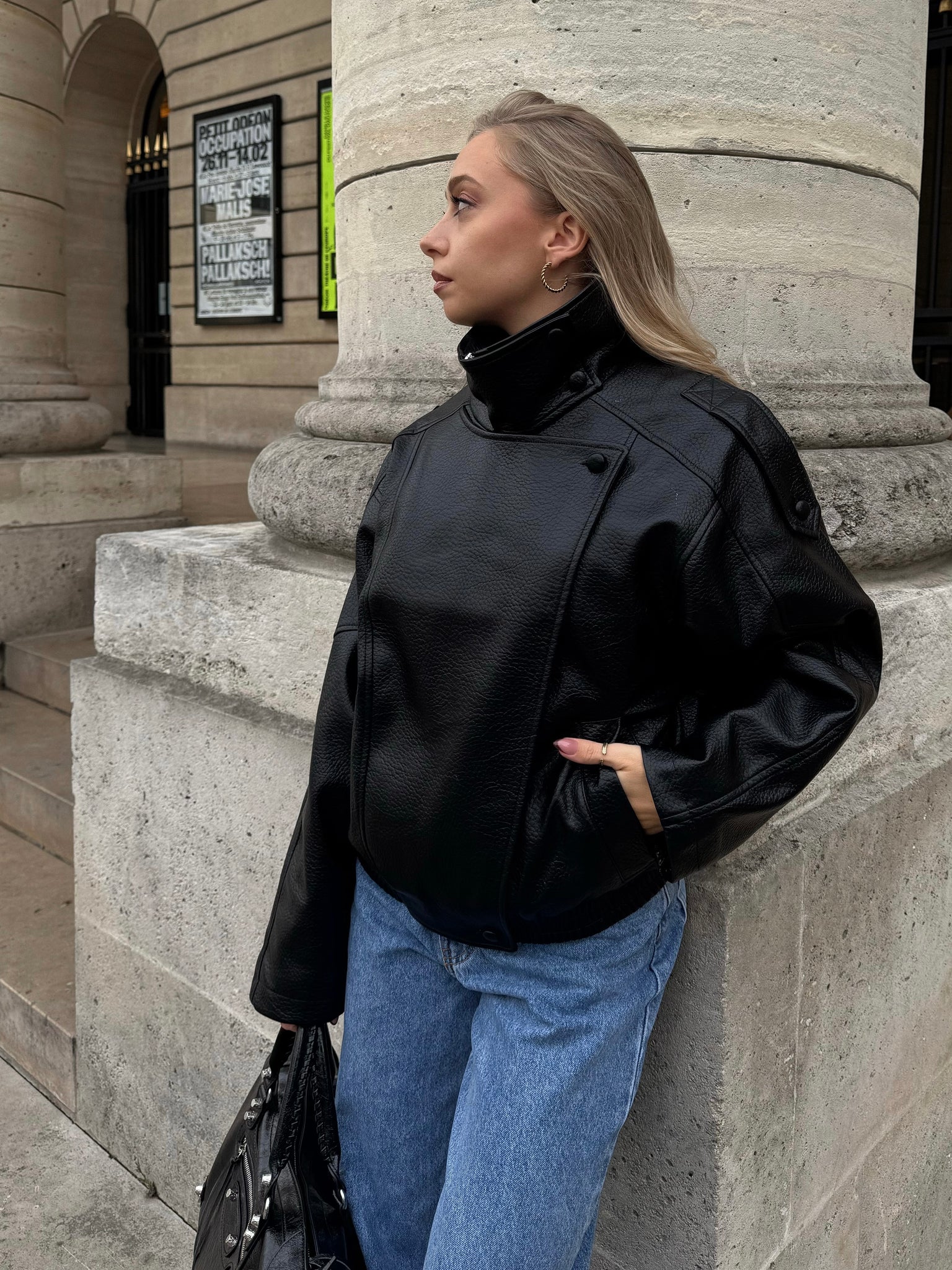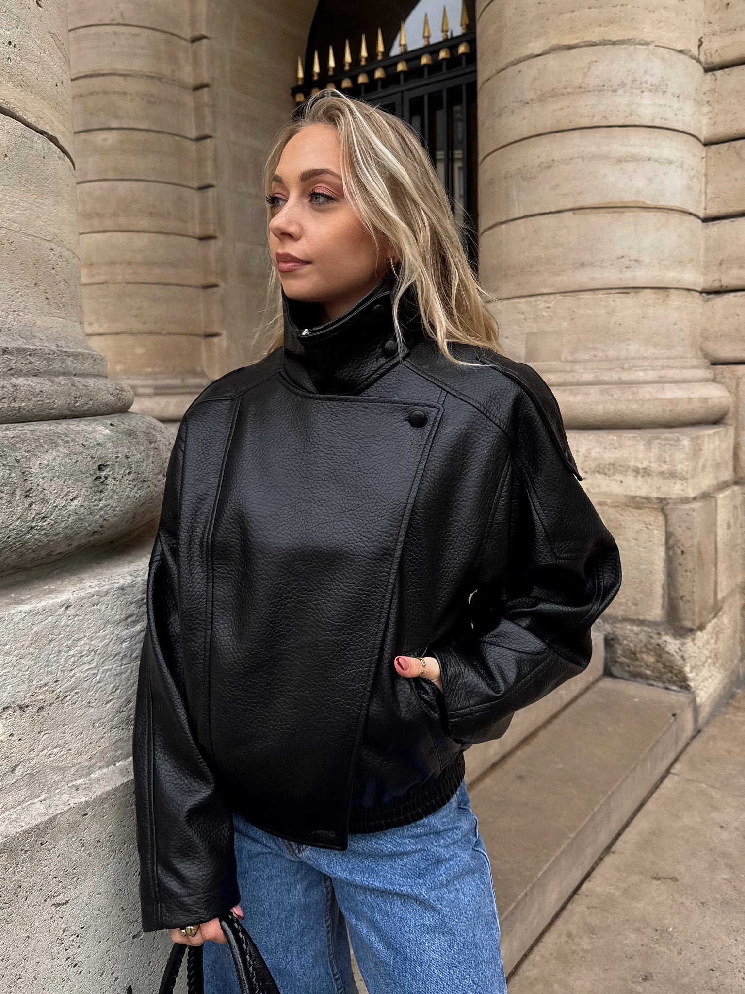 La veste Sonia apporte une touche de caractère à vos tenues avec son look intemporel en simili cuir noir. Sa coupe légèrement oversize et ses détails modernes la rendent idéale pour un style décontracté ou chic. C’est la pièce parfaite pour une allure à la fois audacieuse et élégante.