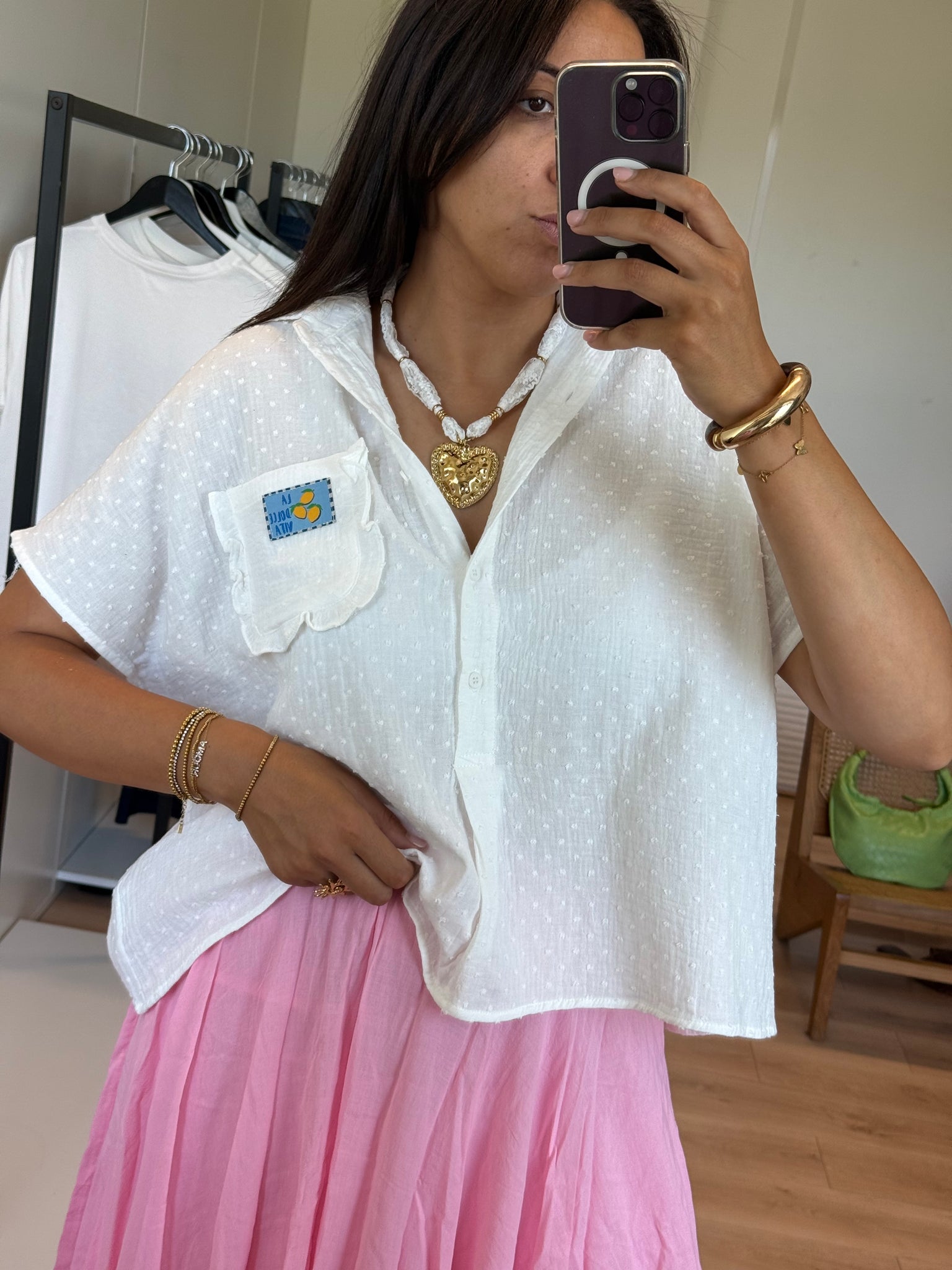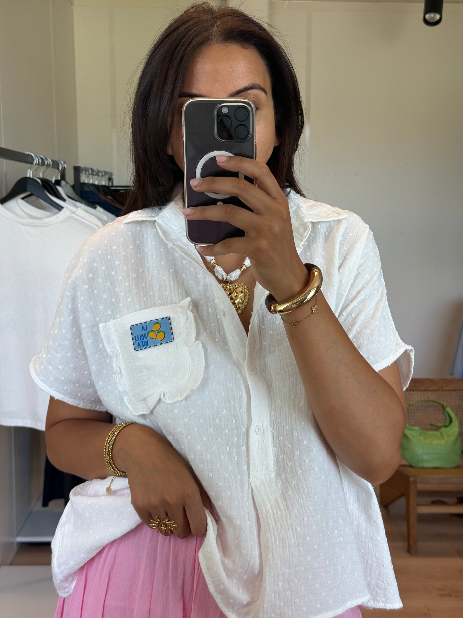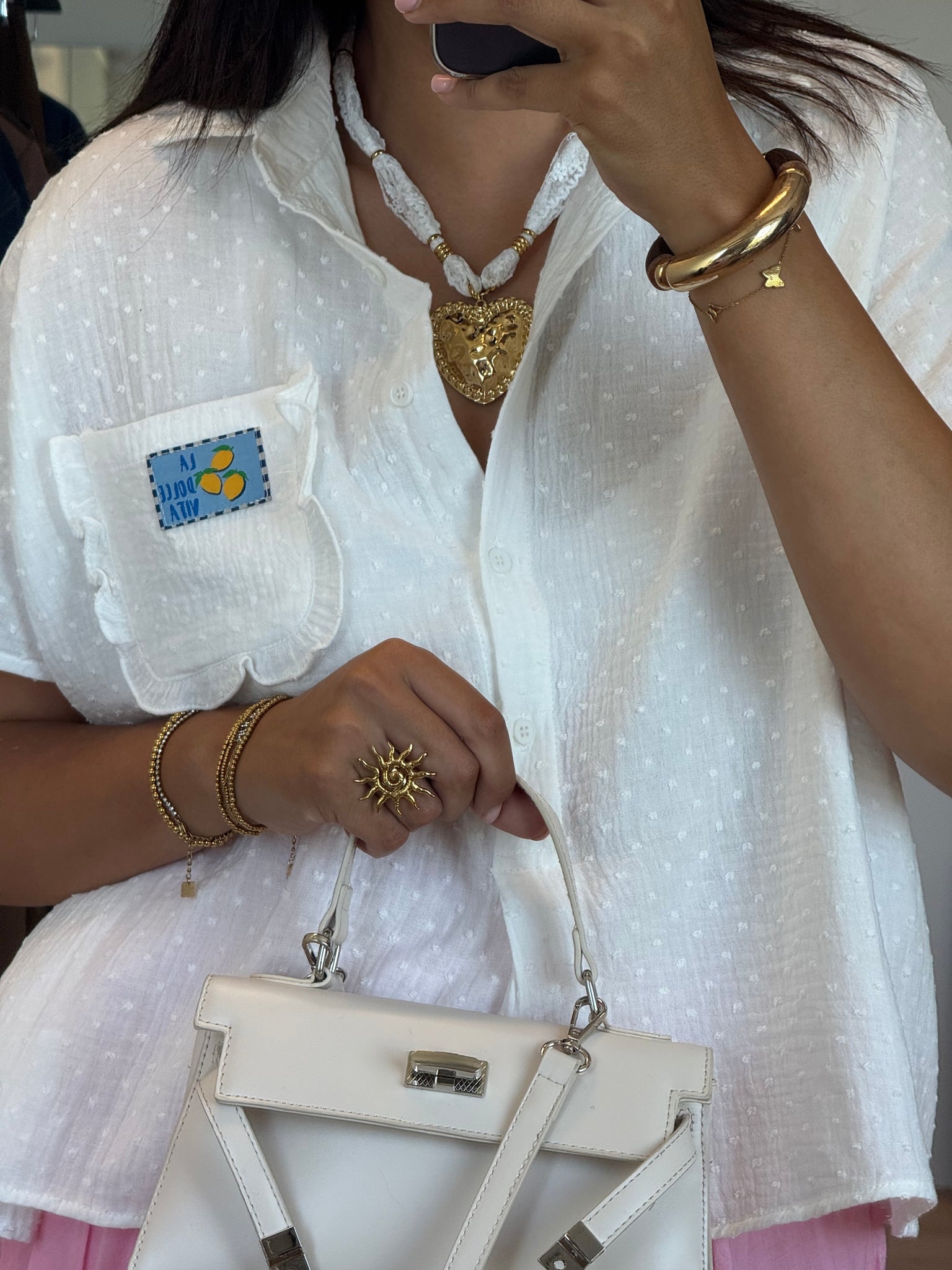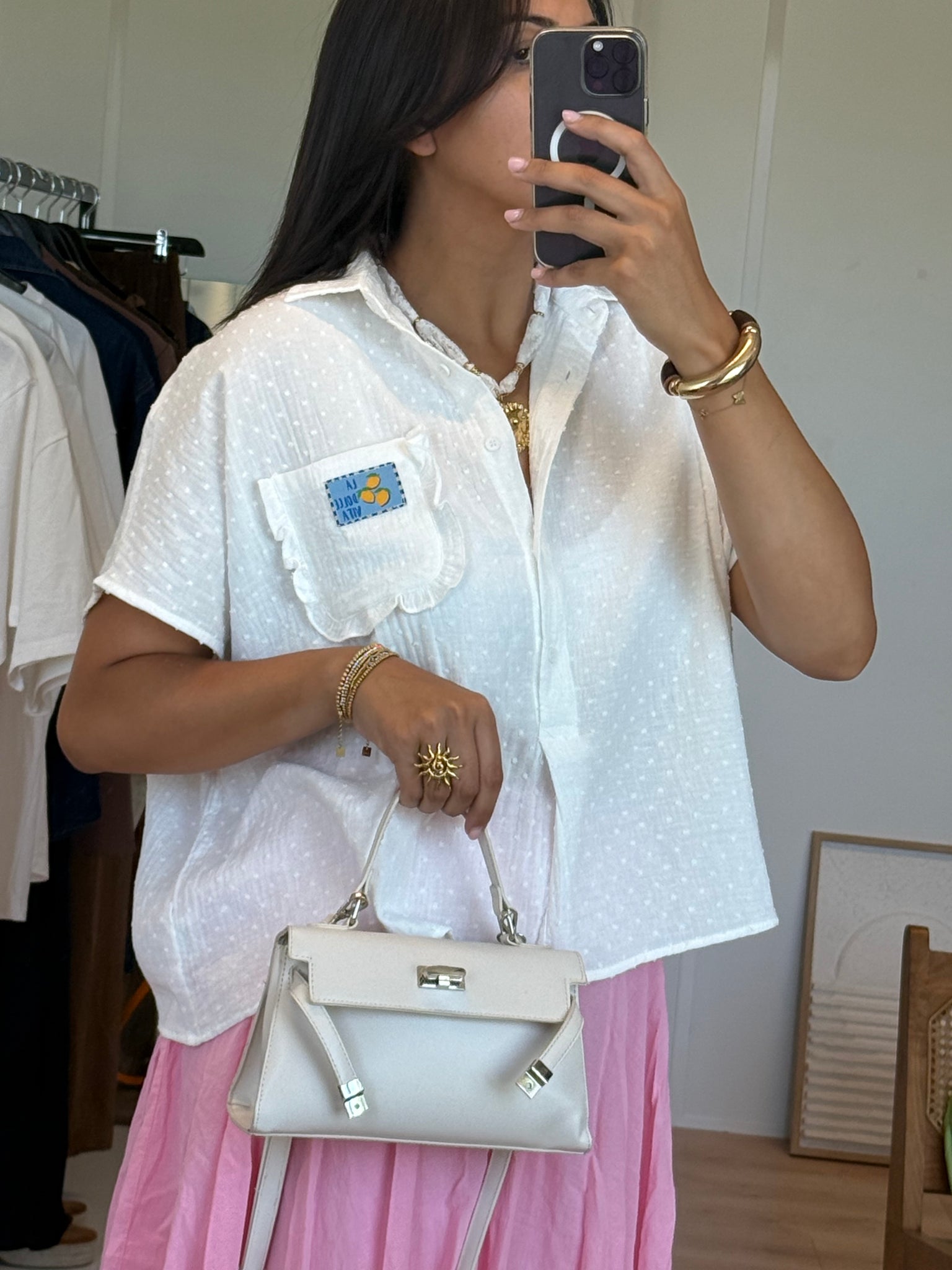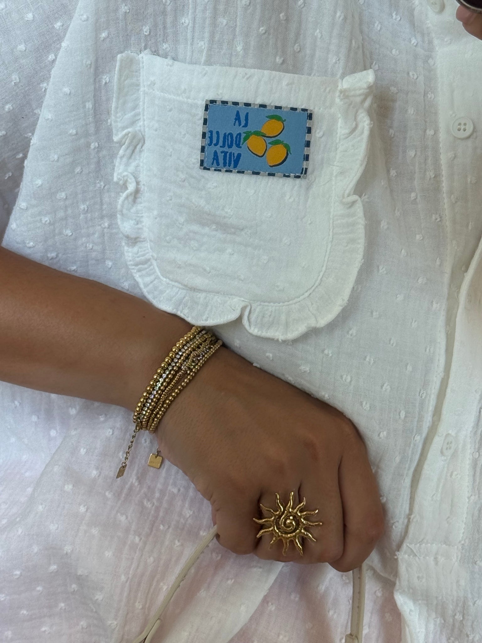 Sa coupe fluide et ample en fait une pièce facile à associer au quotidien. On adore sa petite poche poitrine décorée d’un patch brodé “Dolce Vita”, qui lui donne une touche estivale et pleine de personnalité.