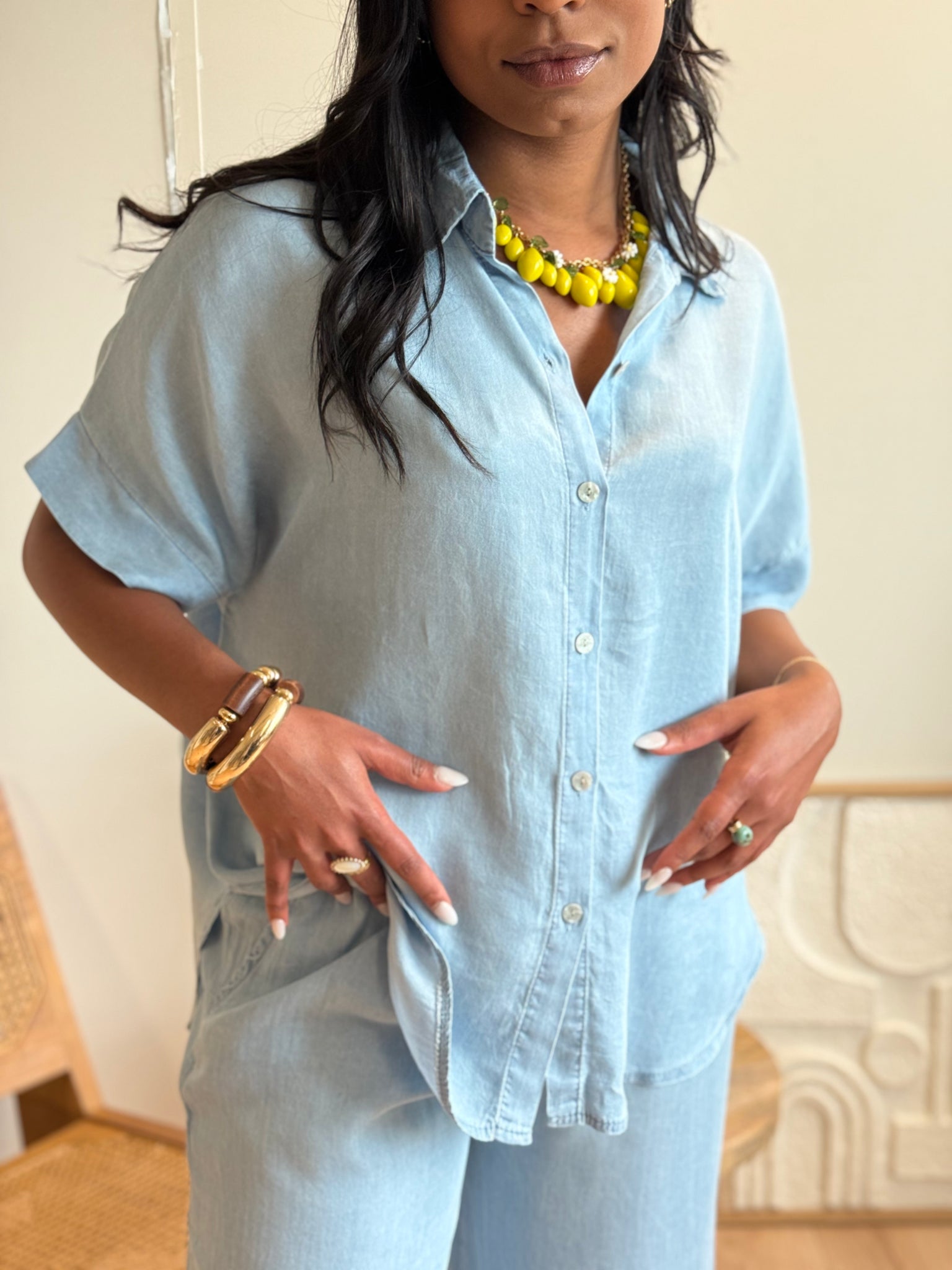 • Top : Chemise ample à manches courtes avec boutons frontaux